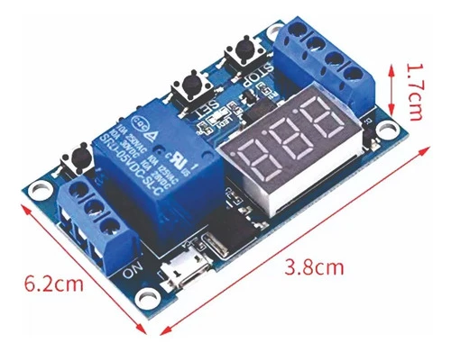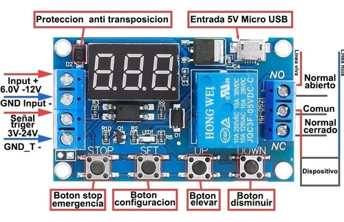 El modulo se compone de una pantalla digital de led de 3 dígitos, un rele, cuatro botones, una entrada micro USB y borneras de entrada y salida.